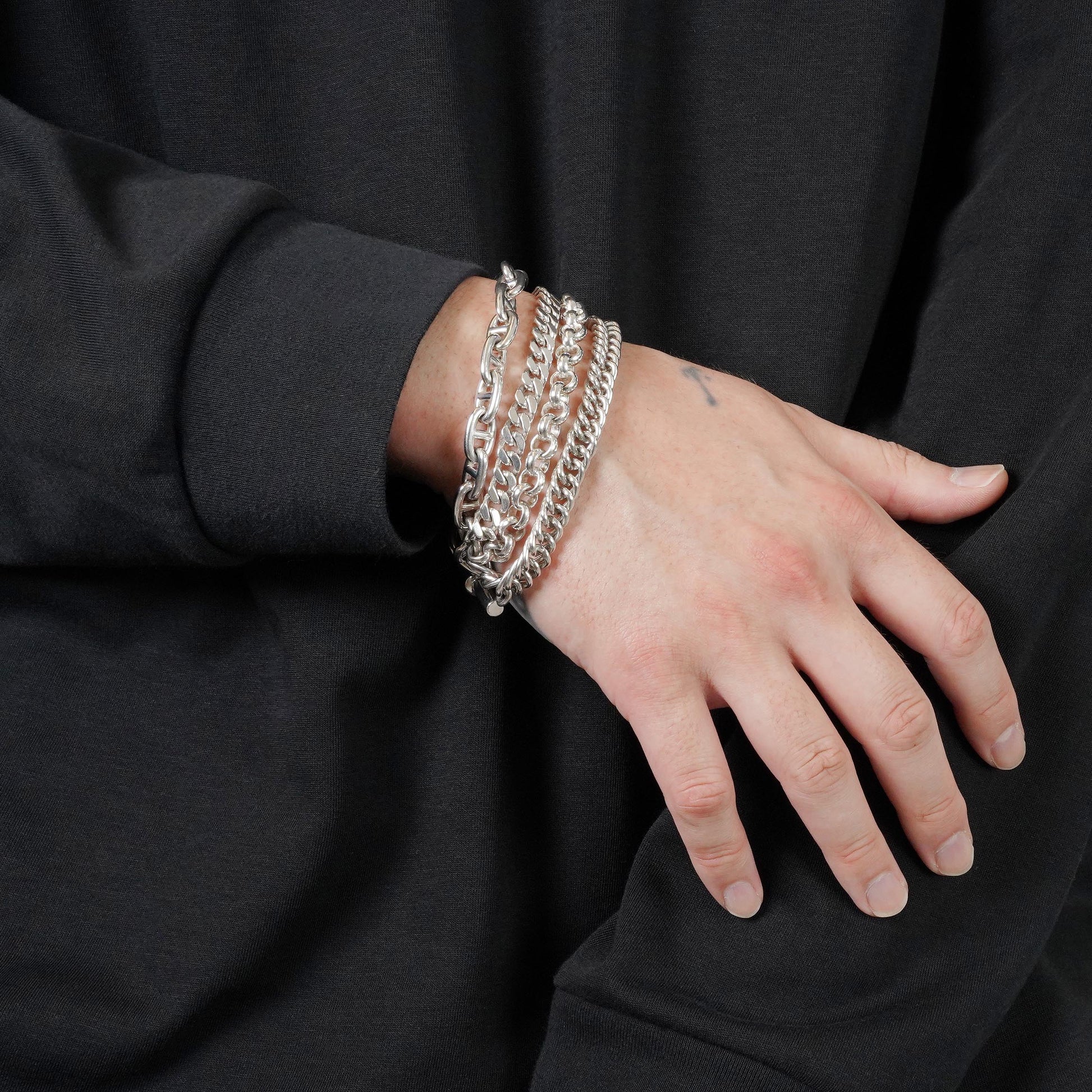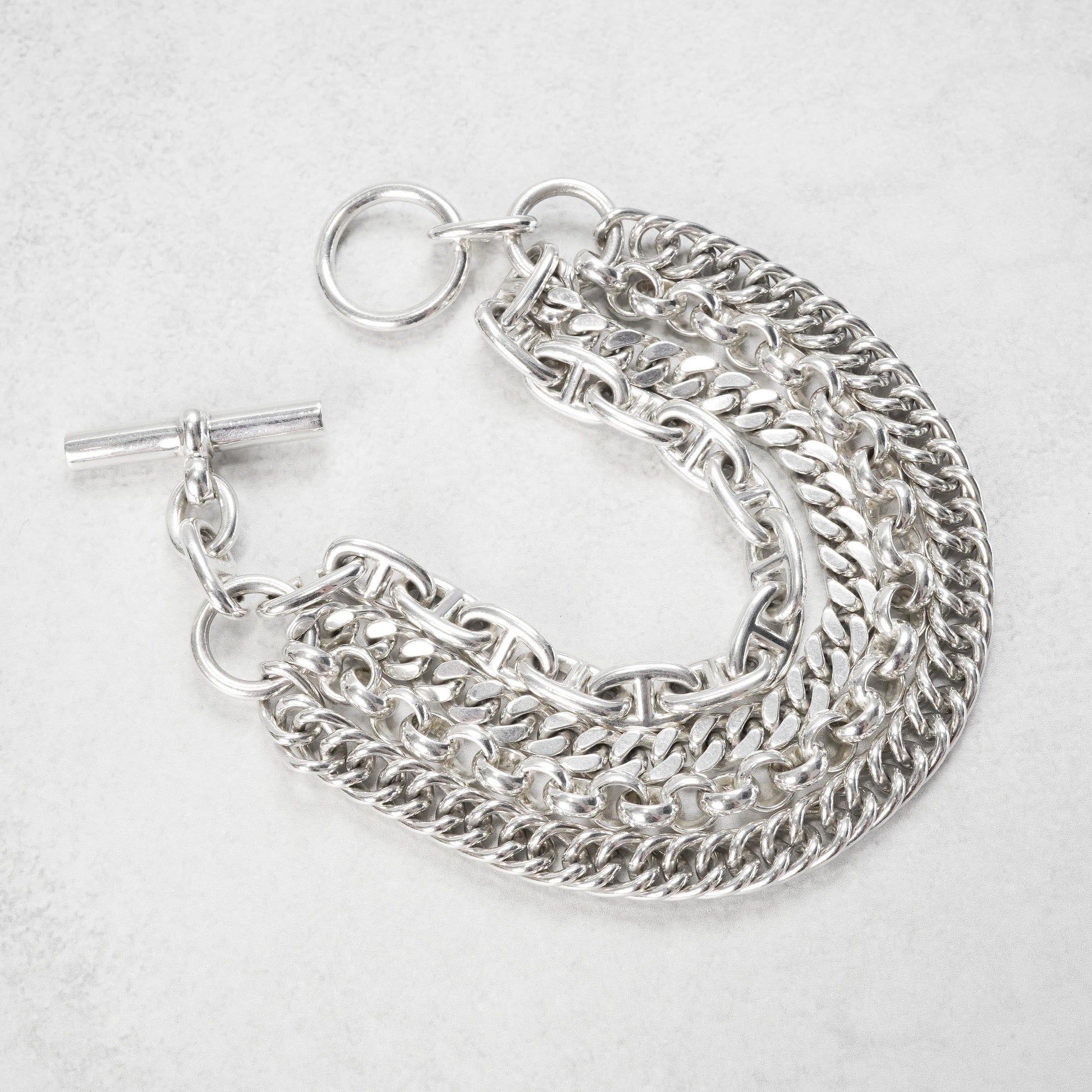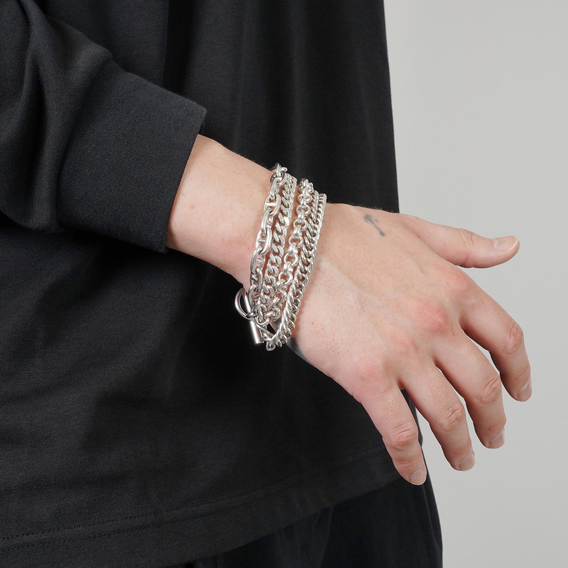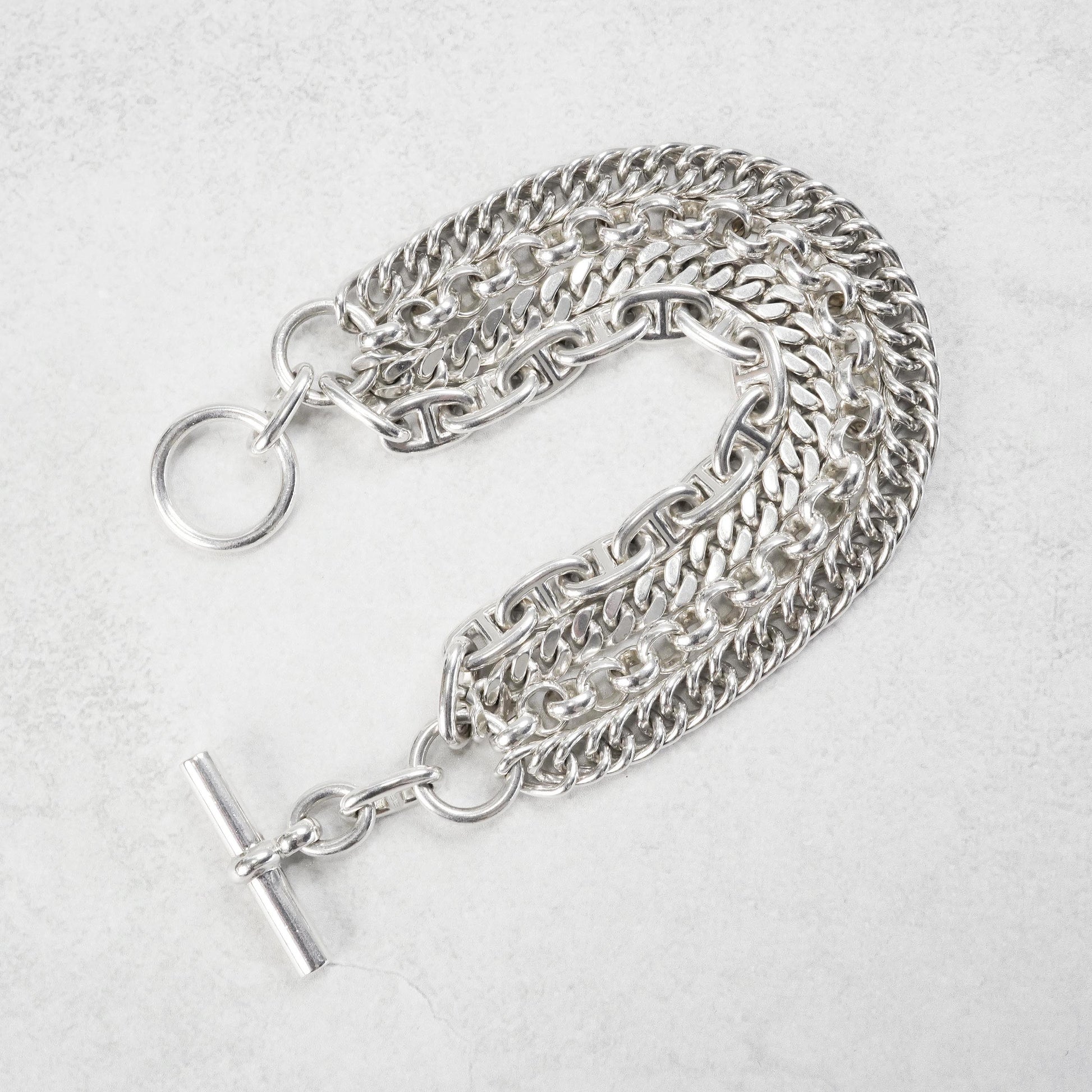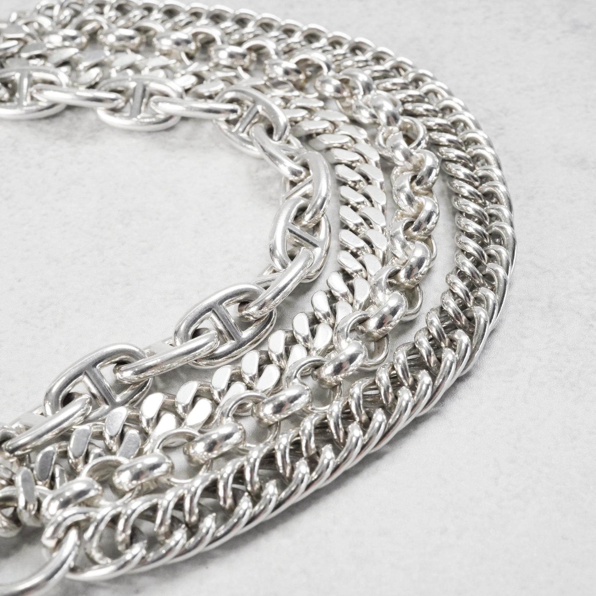 異なる4種類のチェーンで構成されたブレスレット。一本一本は細身なチェーンで、各チェーンの長さは全て異なるので、着用時に手にしっかり沿うように計算されています。