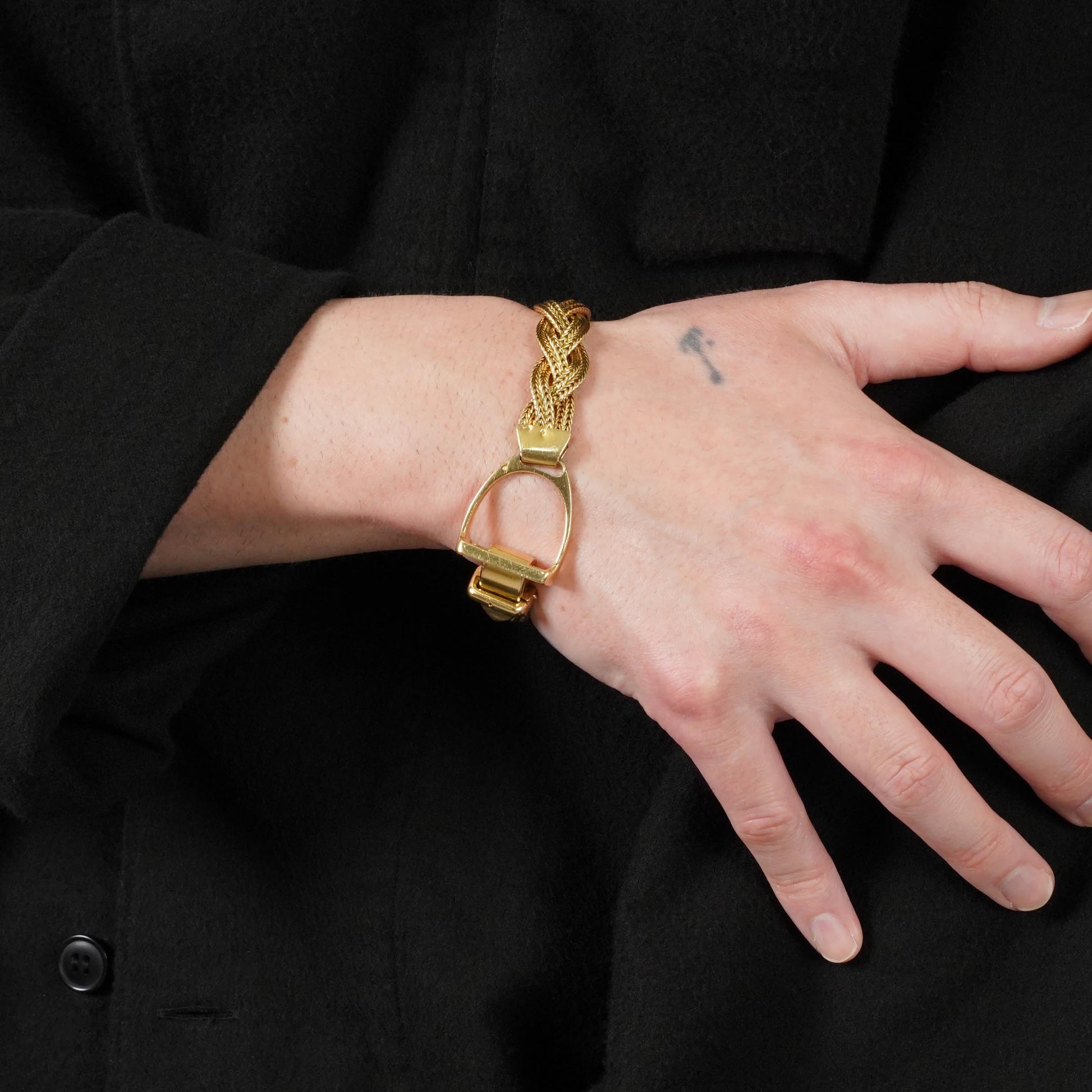 エトリエは、馬具の鐙(あぶみ)をモチーフにデザインされたモデルで、こちらはゴールドヴェルメイユ(金メッキ加工)ではなく、希少なイエローゴールド製のモデルです。丁寧に編み込まれたチェーンで構成されており、エルメスヴィンテージジュエリーならではの魅力が存分に感じられる美術品のような作品です。