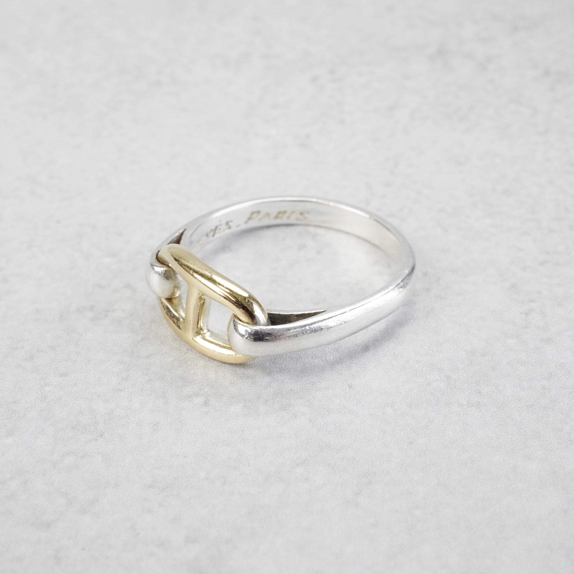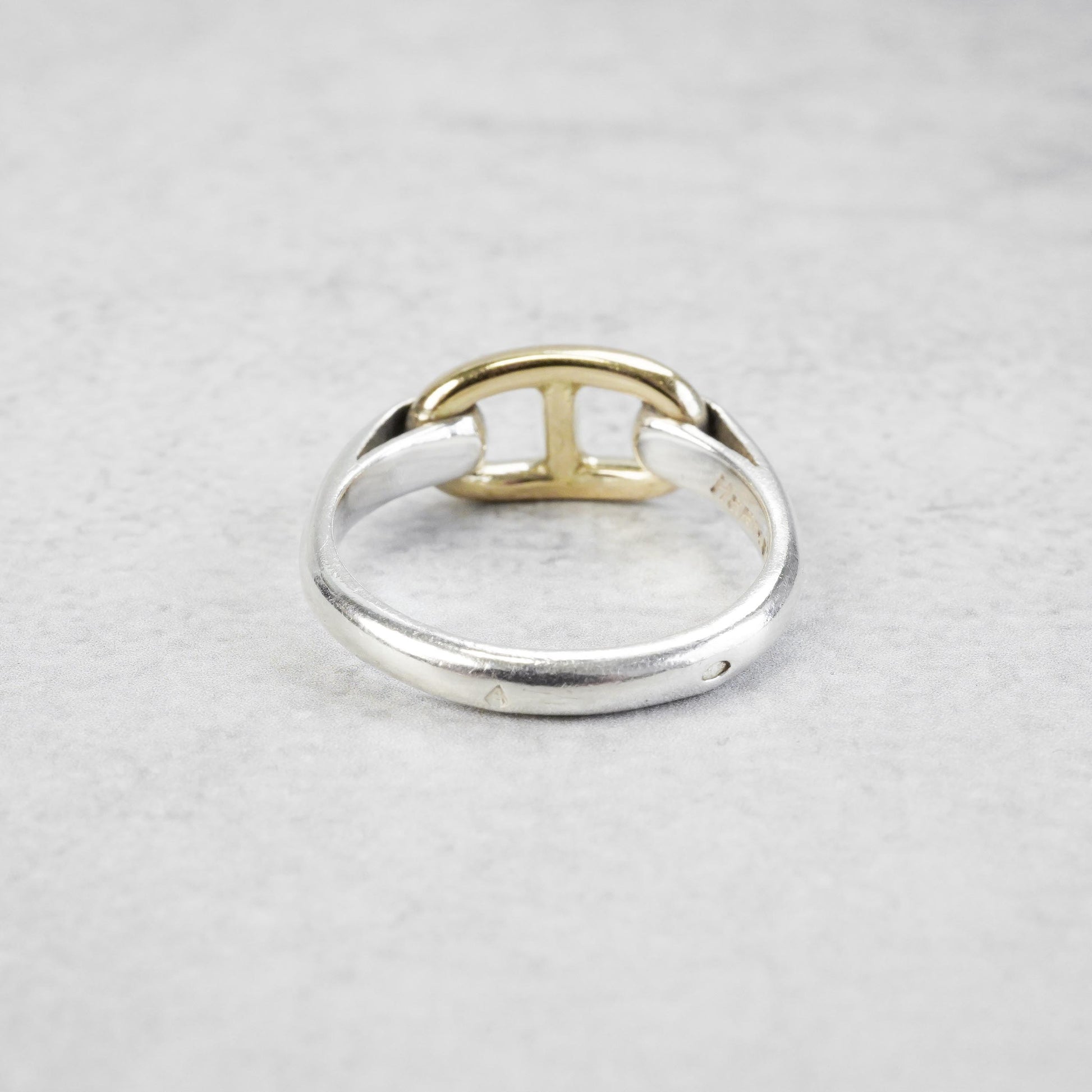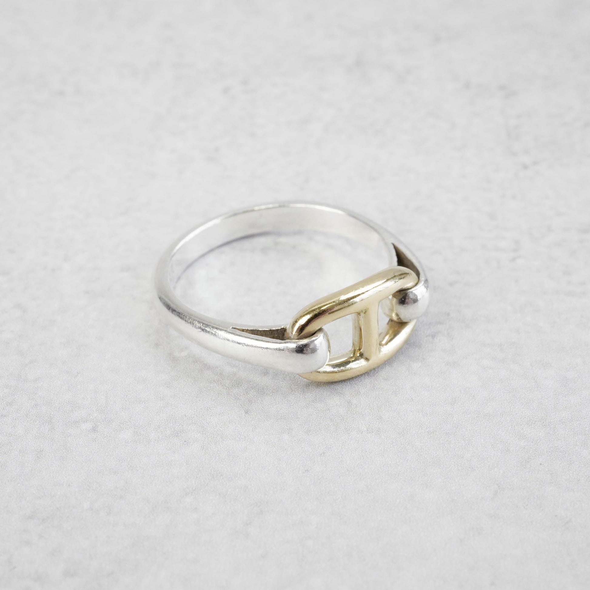 エルメスのヴィンテージリングの中でも最近特に人気の高い、シェーヌダンクルモチーフのコンビリングです。このモデルはコマの大きさが2種類ありますが、こちらは小さめのコマのモデルです。