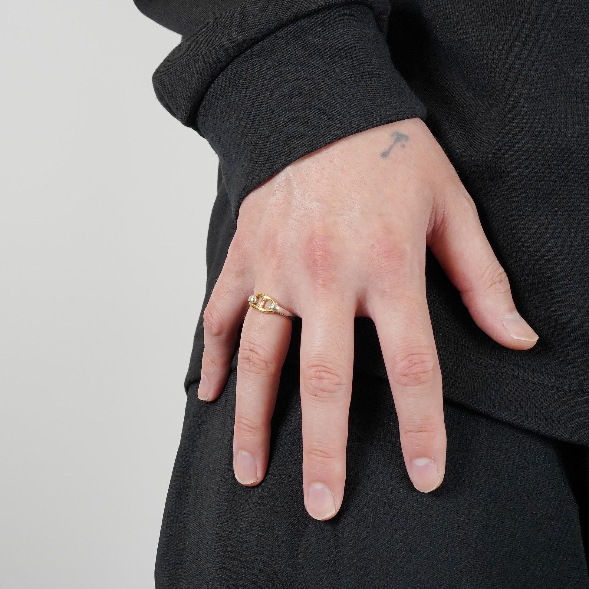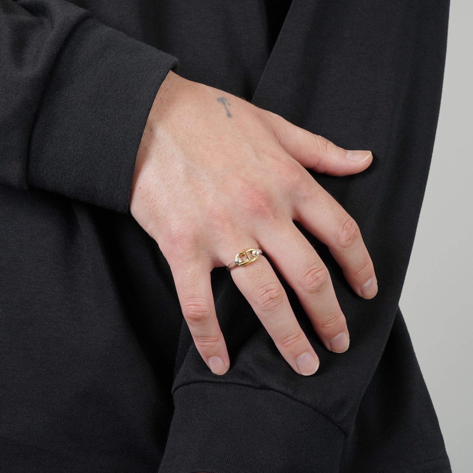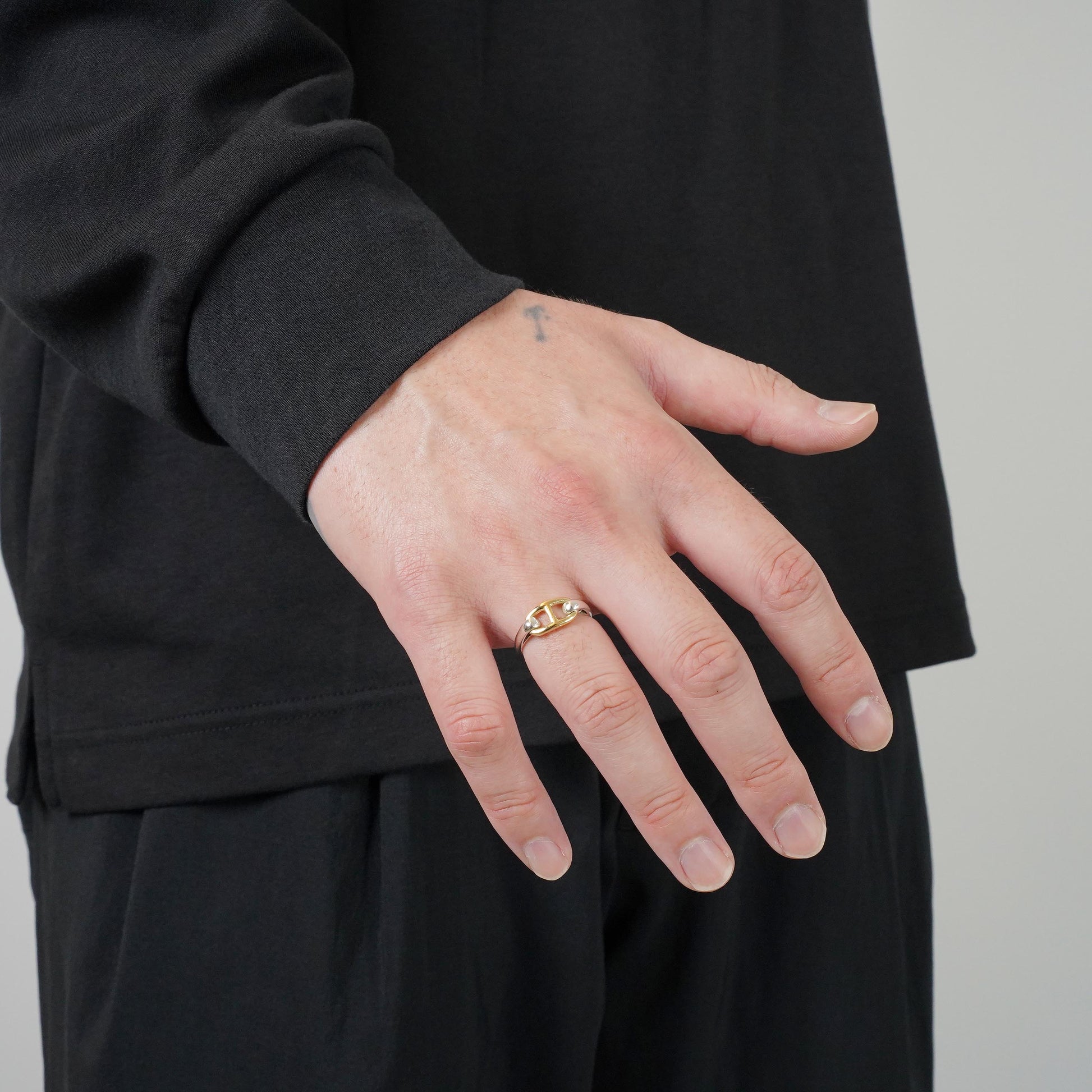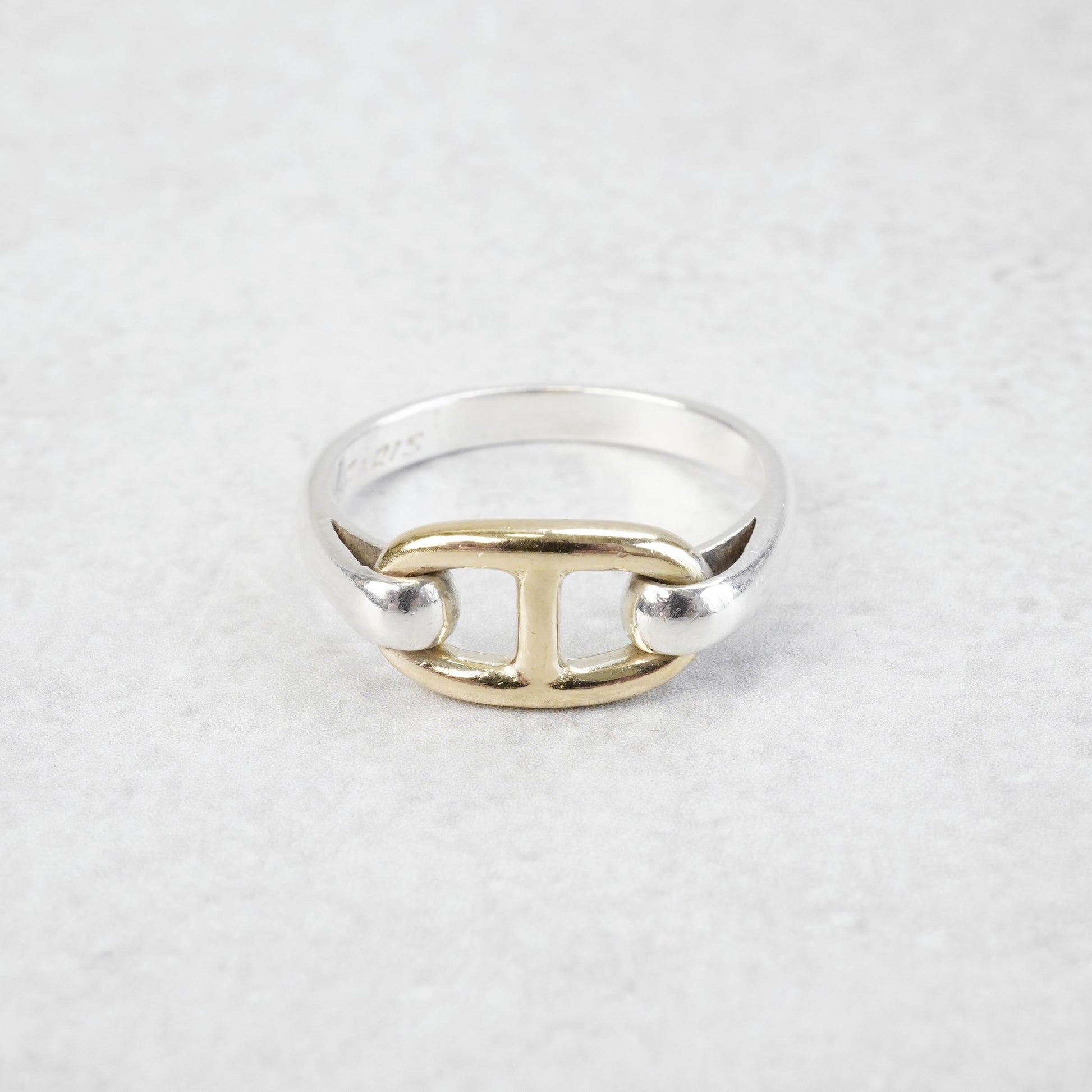エルメスのヴィンテージリングの中でも最近特に人気の高い、シェーヌダンクルモチーフのコンビリングです。このモデルはコマの大きさが2種類ありますが、こちらは小さめのコマのモデルです。