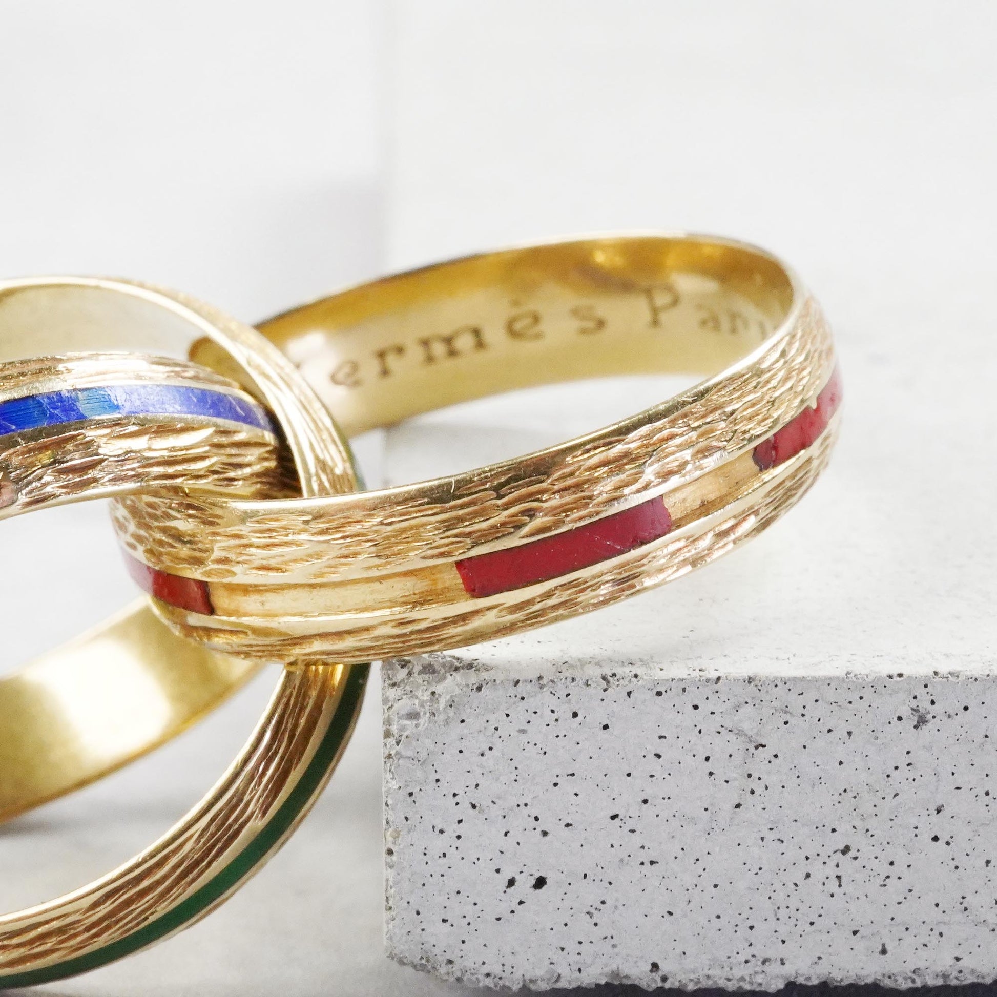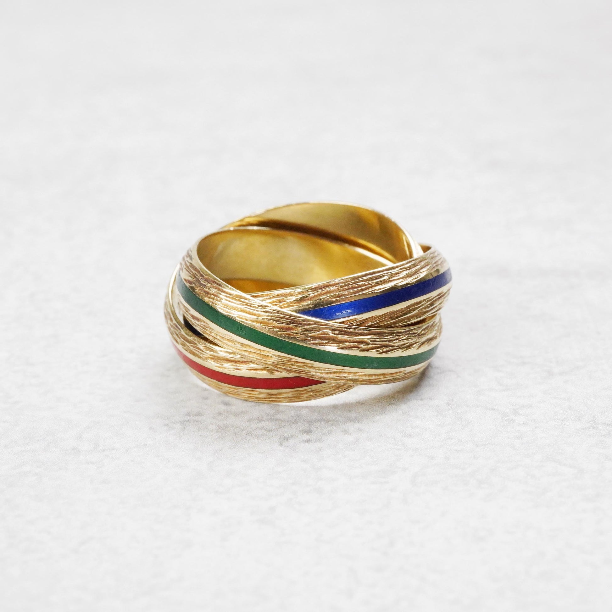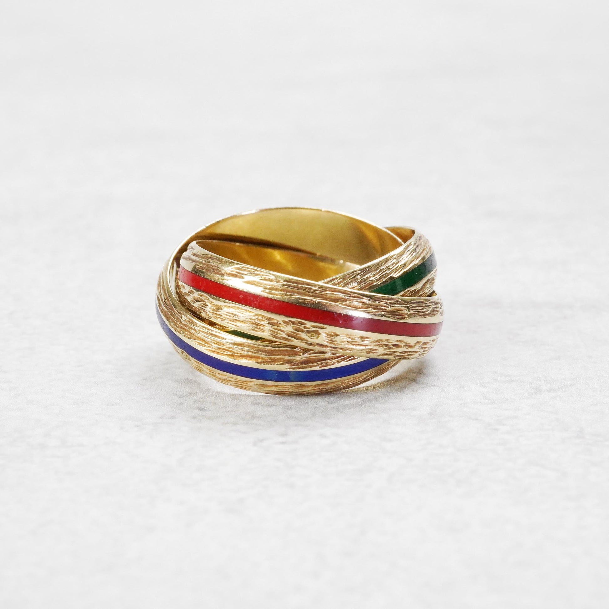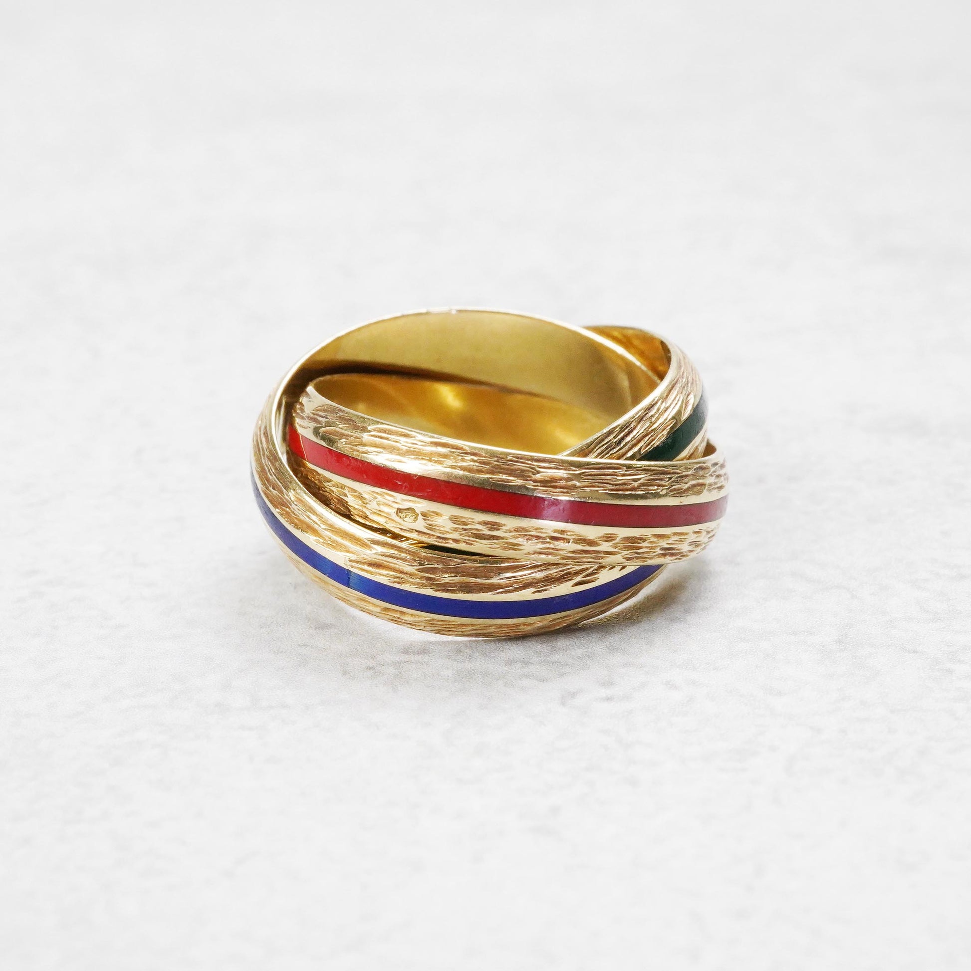 イエローゴールド製のリングに、赤、青、緑の3つカラーのエナメルのラインがデザインされた、エルメスのトリニティリング。ヴィンテージエルメスジュエリーらしく、彫り込みが施されたデザインも特徴。