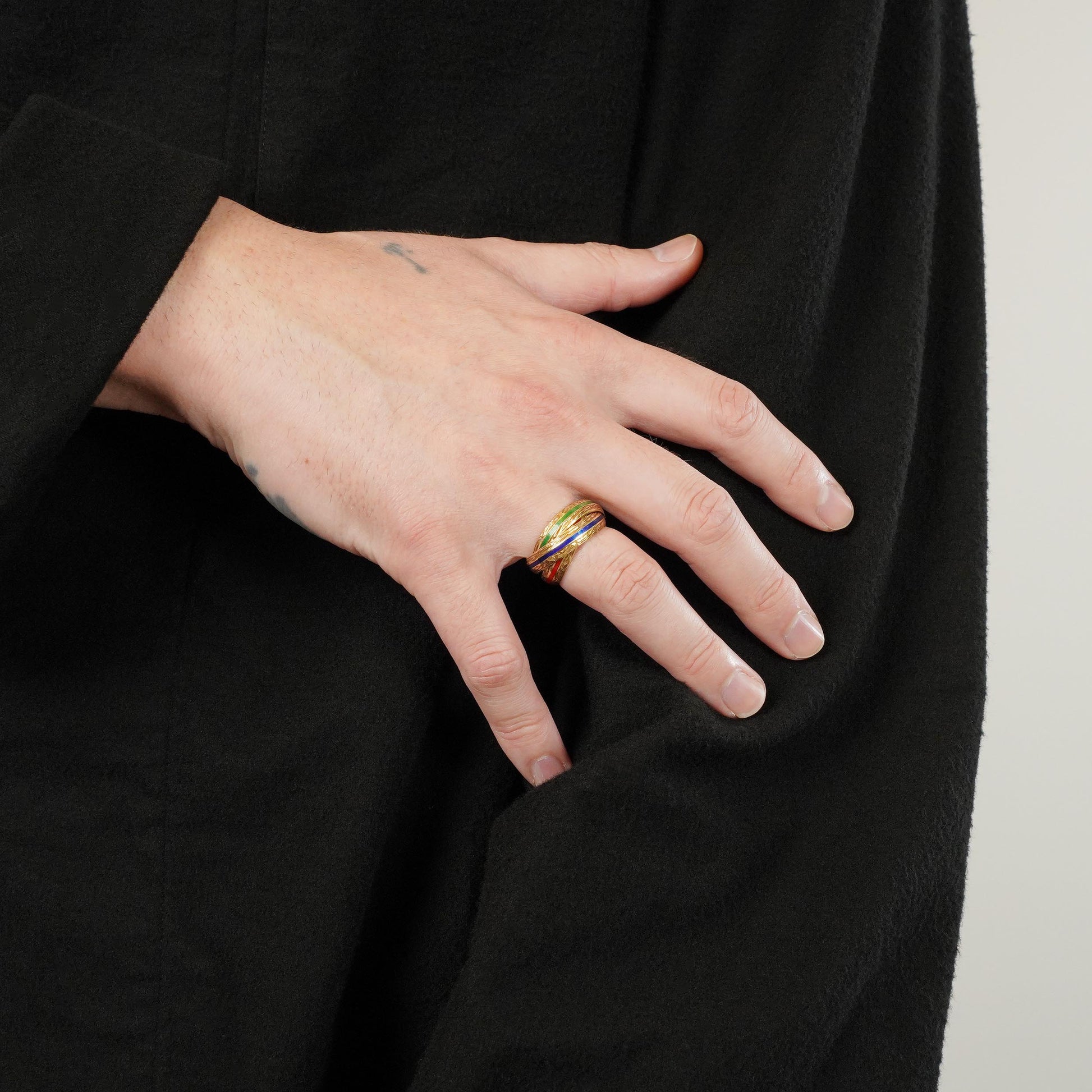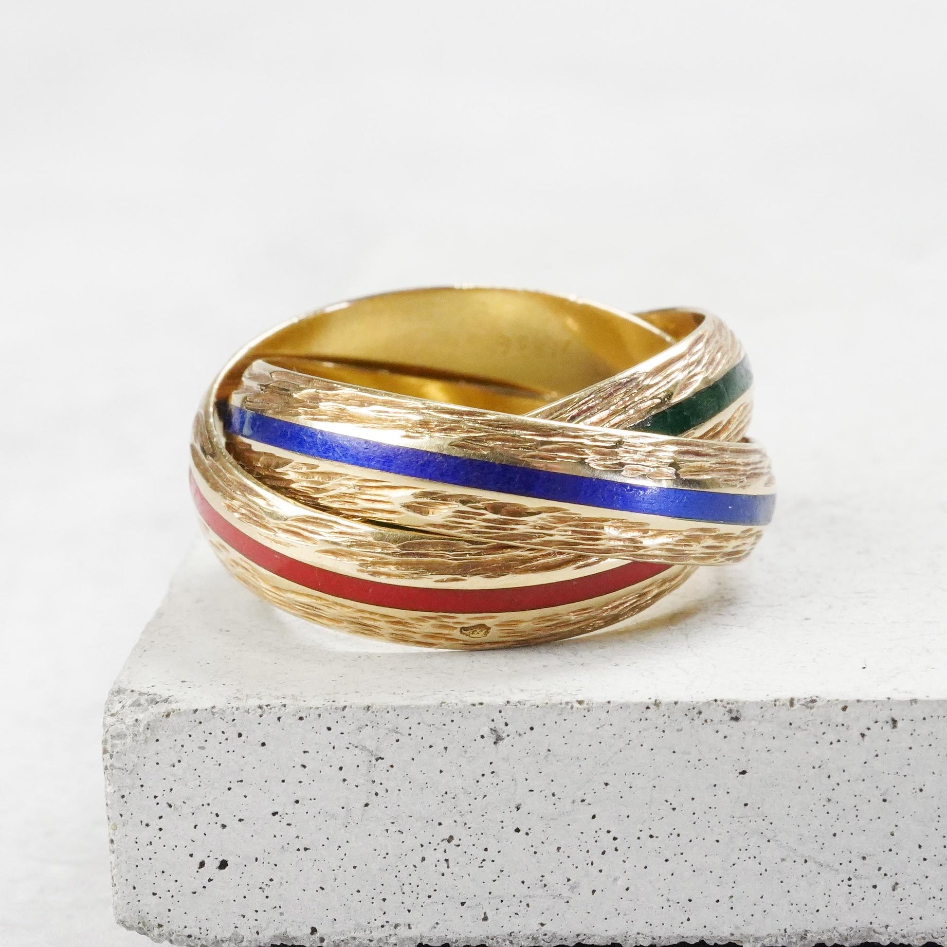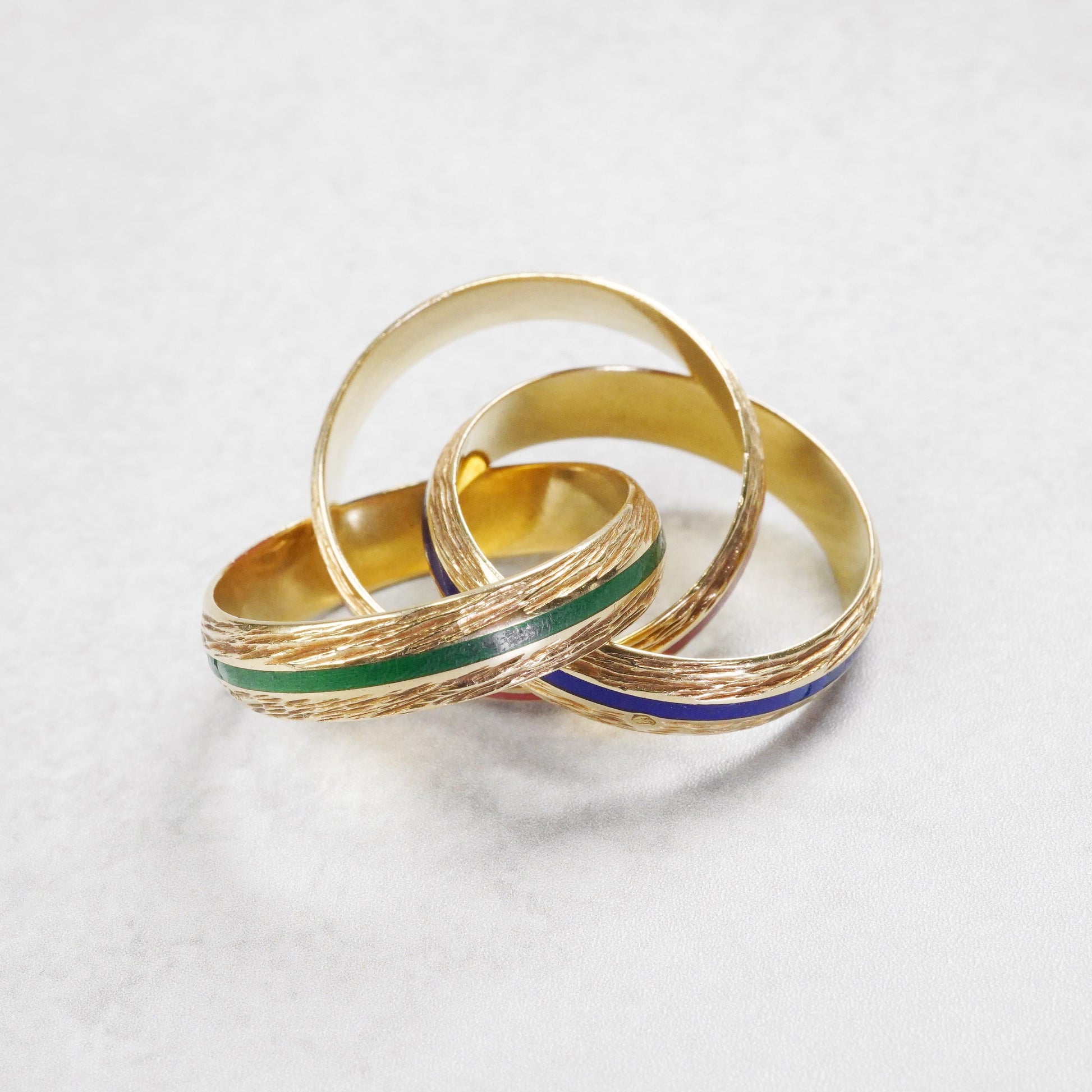 イエローゴールド製のリングに、赤、青、緑の3つカラーのエナメルのラインがデザインされた、エルメスのトリニティリング。ヴィンテージエルメスジュエリーらしく、彫り込みが施されたデザインも特徴。