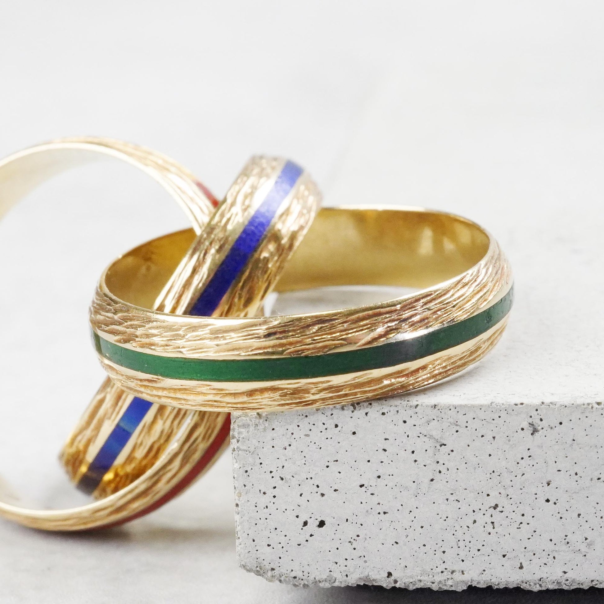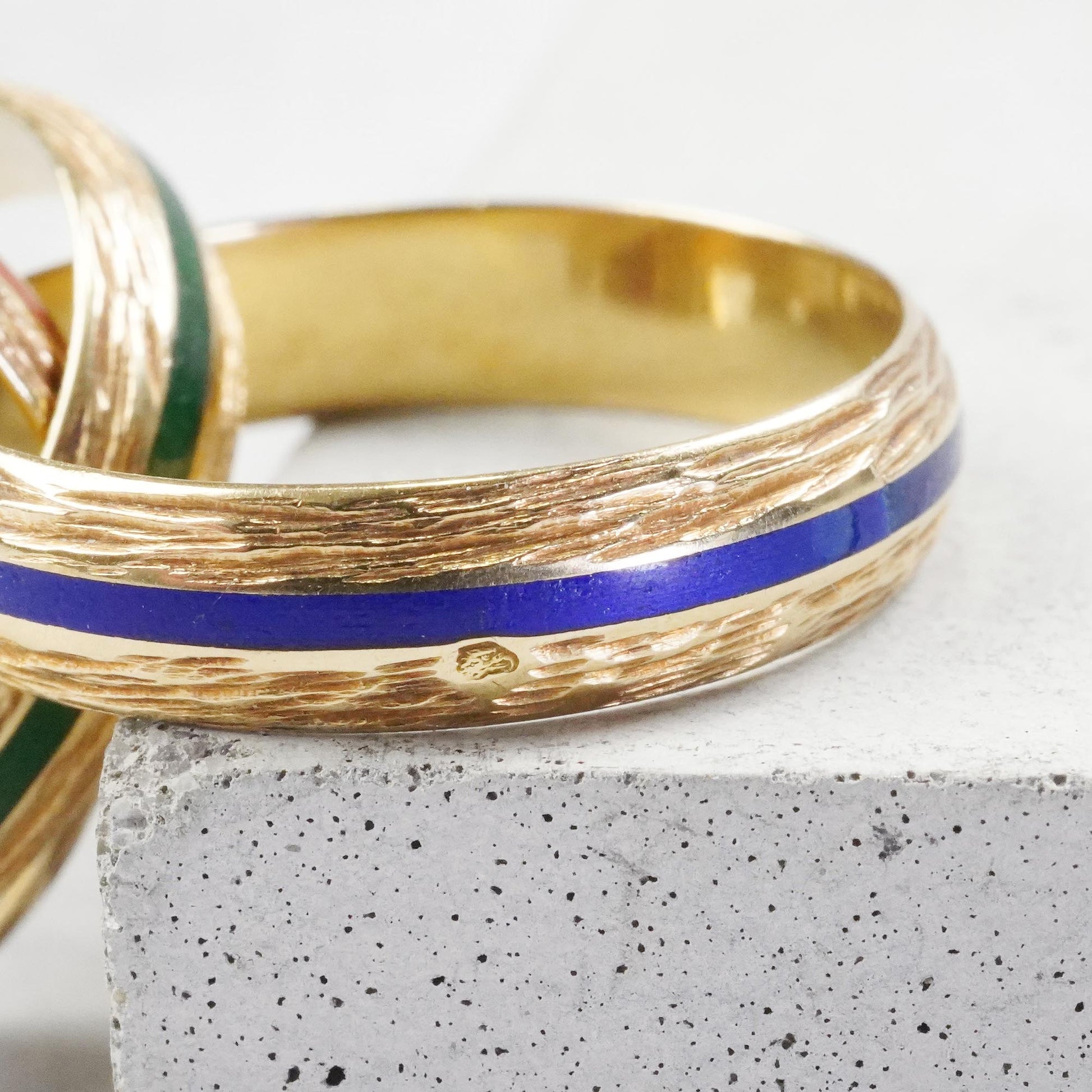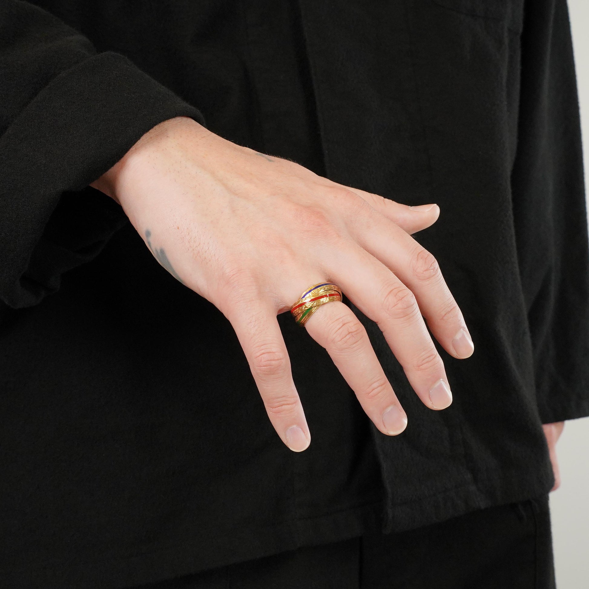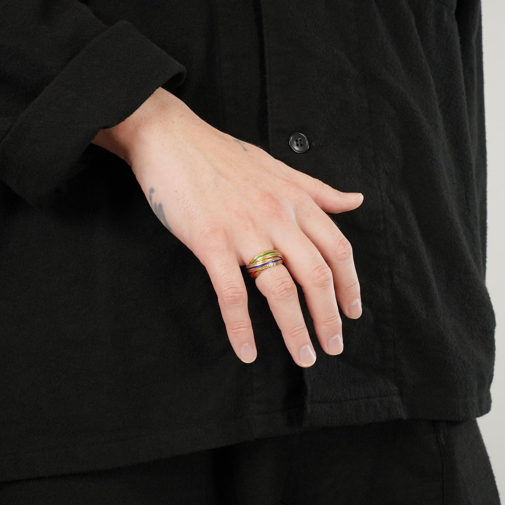 イエローゴールド製のリングに、赤、青、緑の3つカラーのエナメルのラインがデザインされた、エルメスのトリニティリング。ヴィンテージエルメスジュエリーらしく、彫り込みが施されたデザインも特徴。