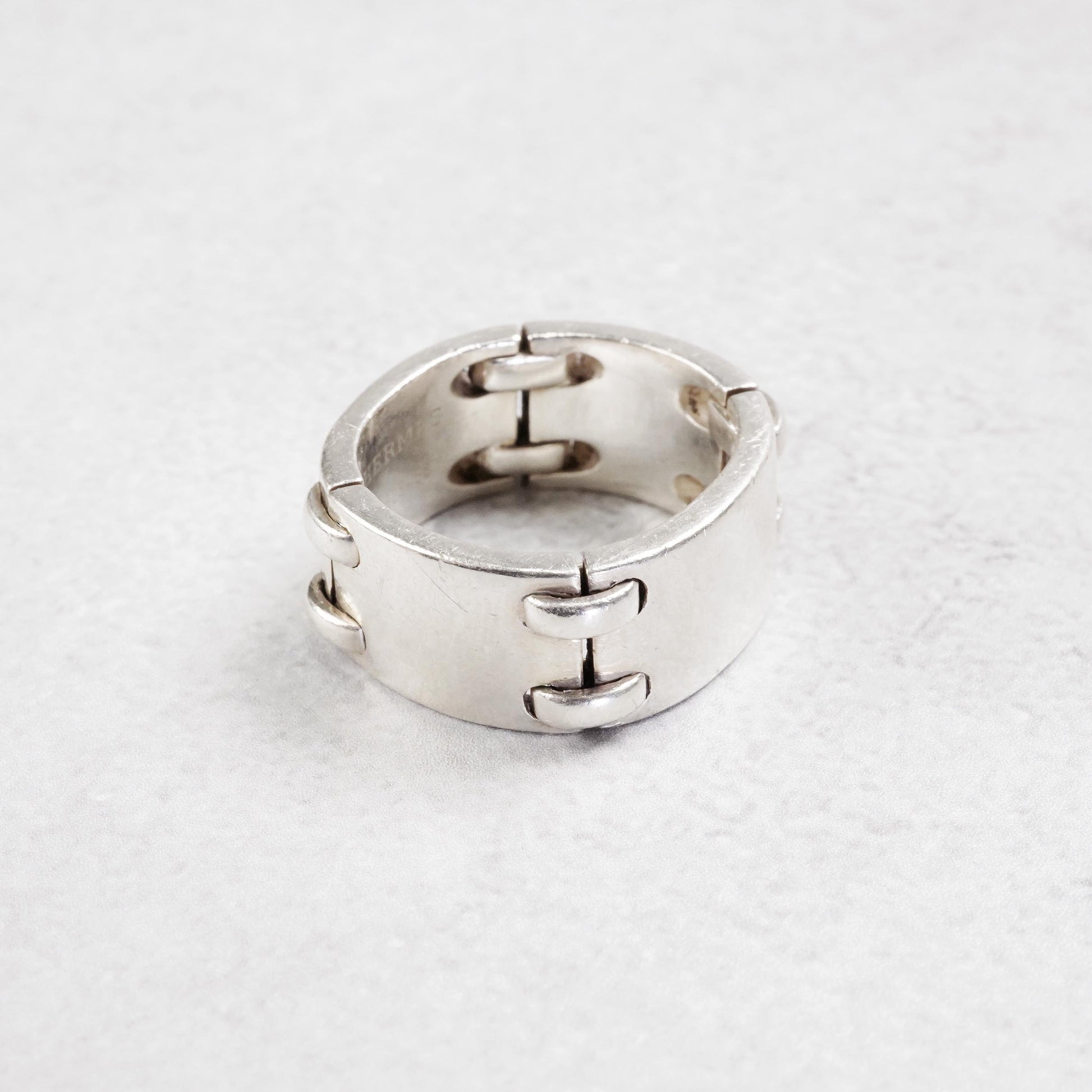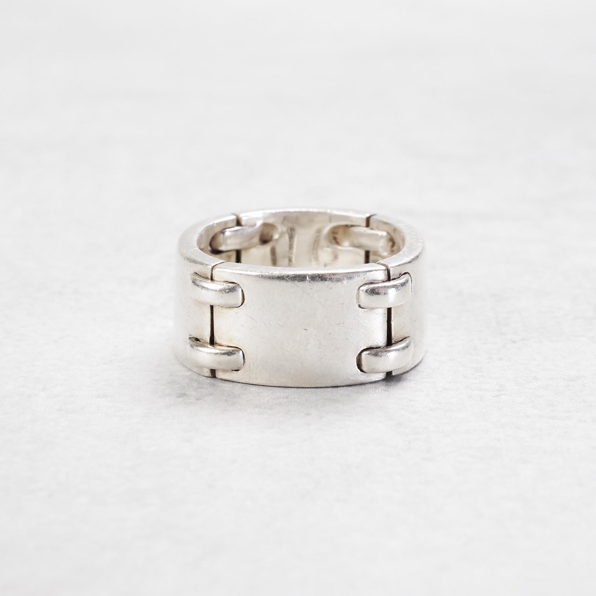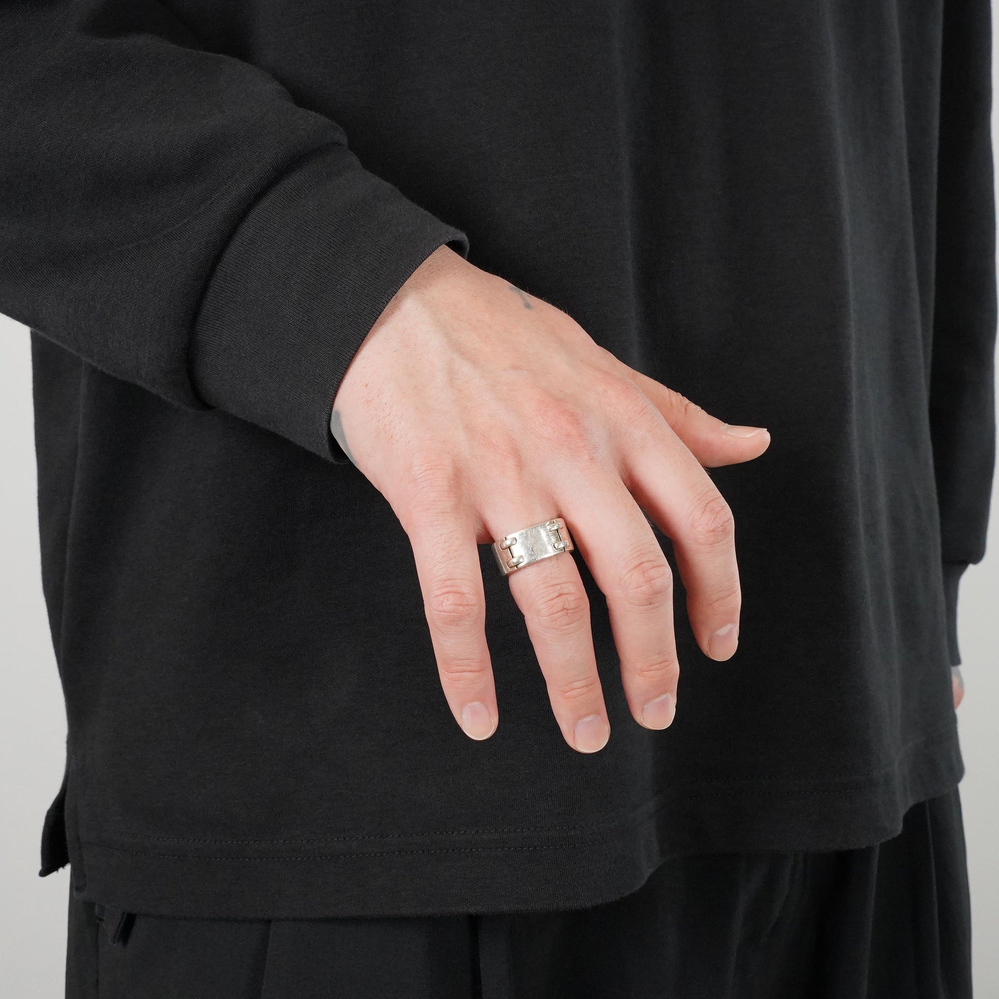 4つのプレートと、それを繋ぐパーツで構成された、鎧のようなリング。男性でも着用可能な希少サイズです。