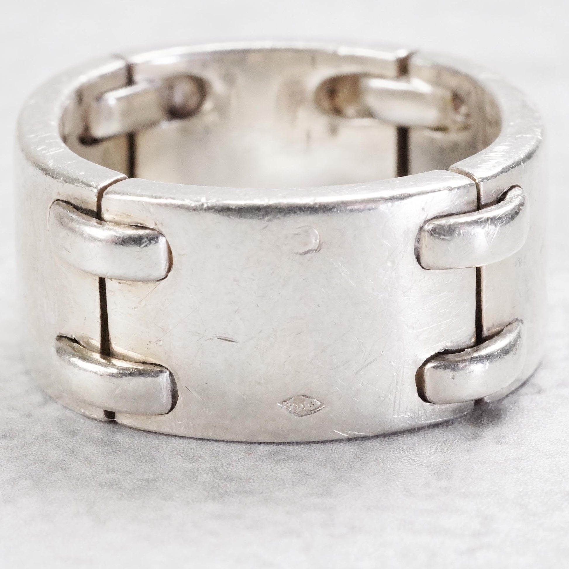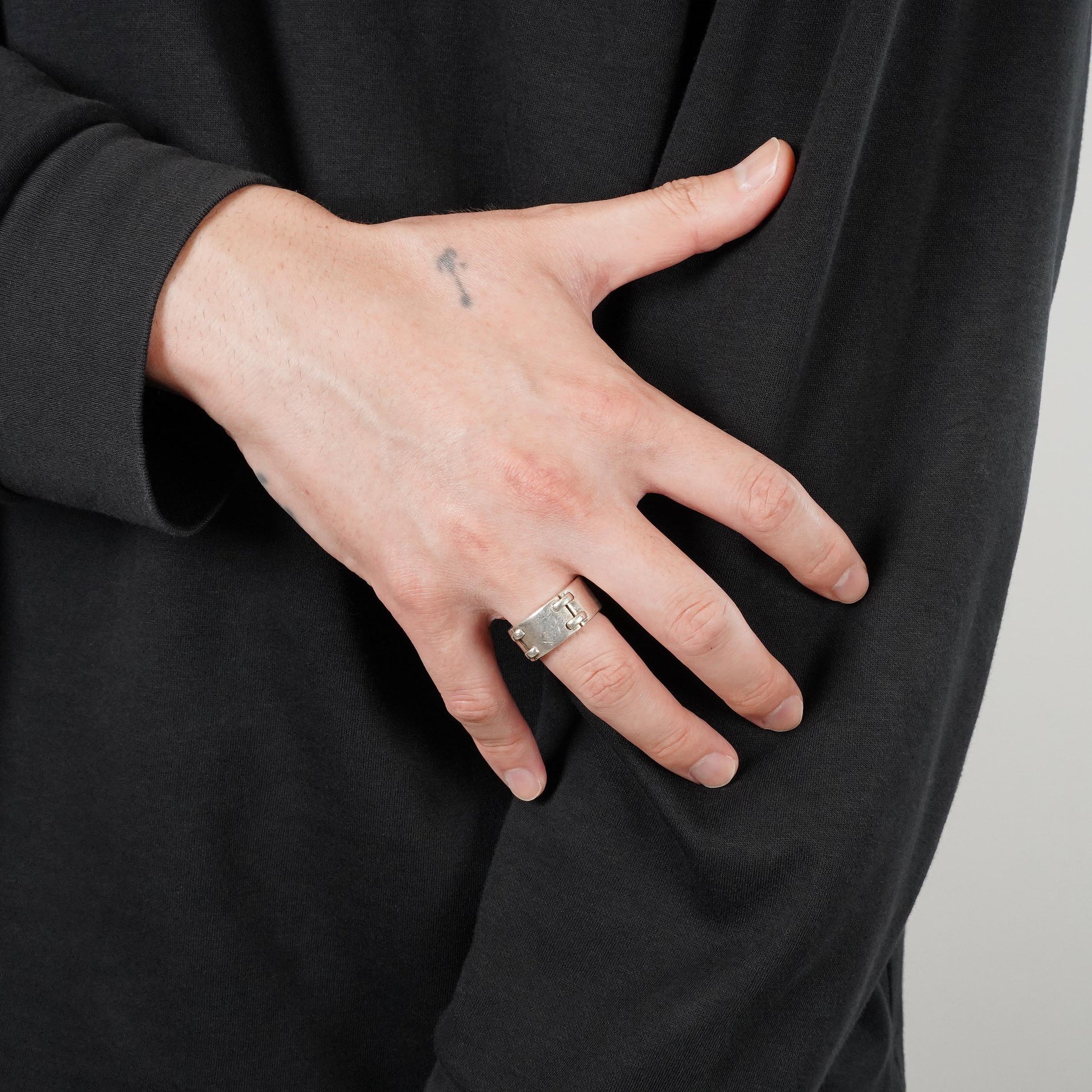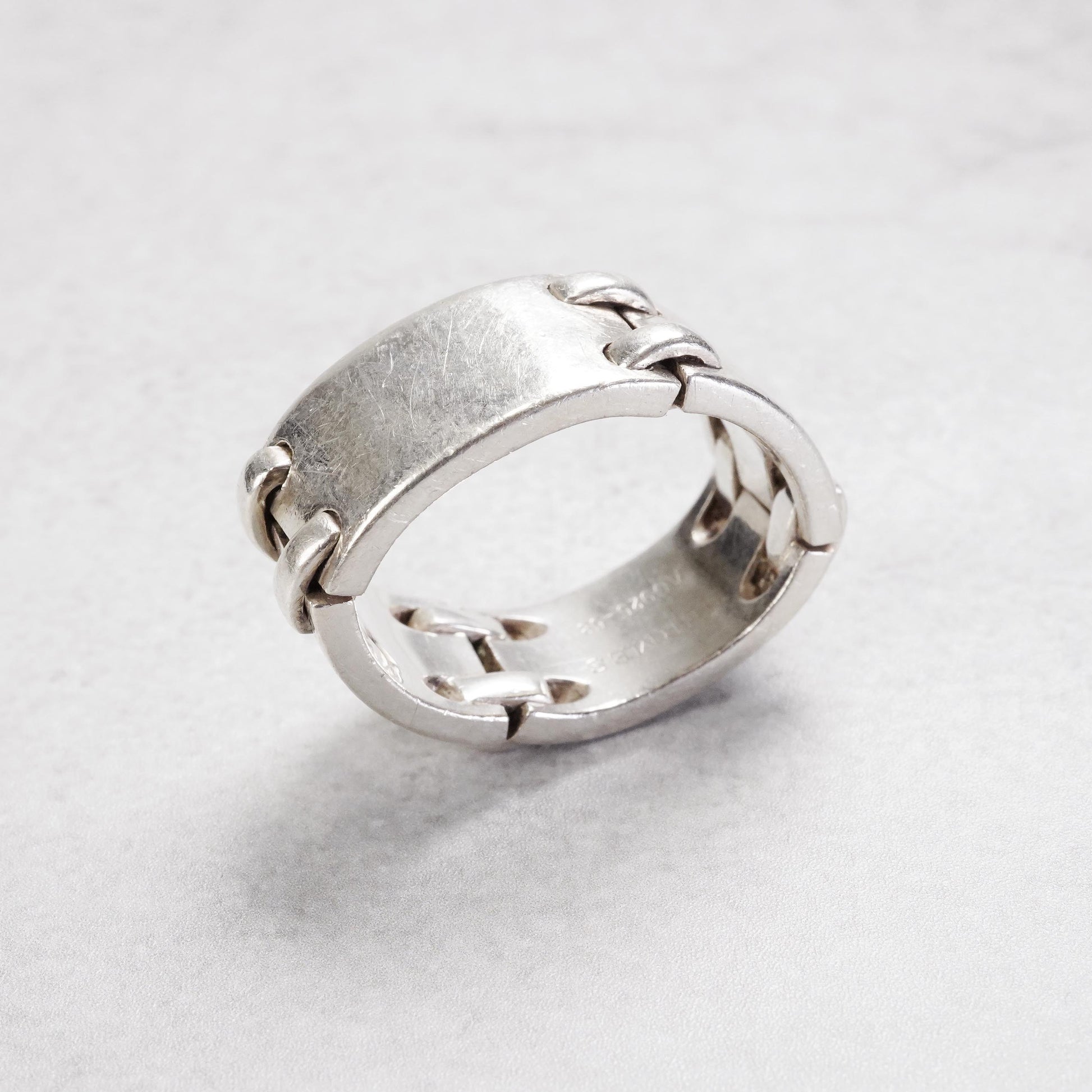 4つのプレートと、それを繋ぐパーツで構成された、鎧のようなリング。男性でも着用可能な希少サイズです。